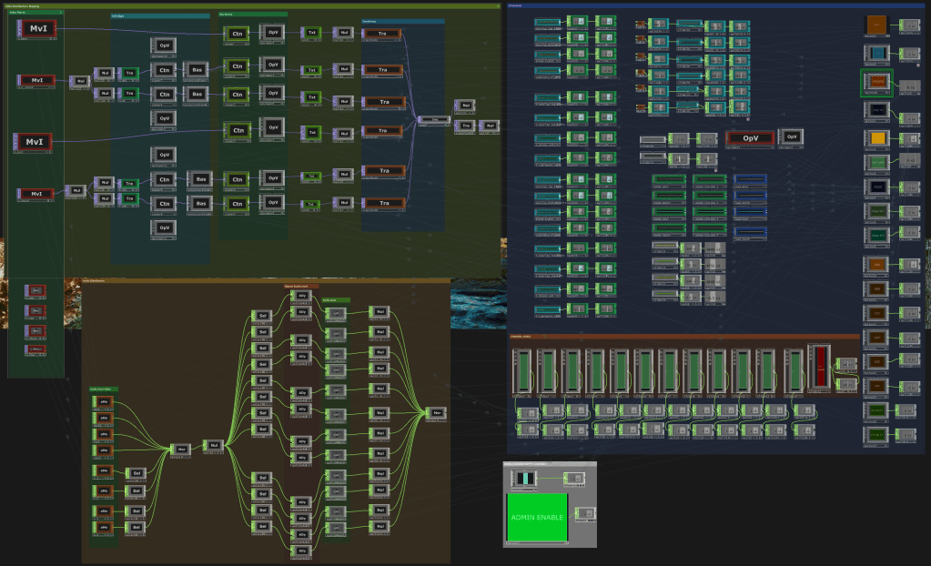 Inside of the AV distribution for the projection room at Mystic Ozark experience. Hots Springs National Park, AR.Part of the U.I . I used to projection map the room remotely from 1400 miles away.
